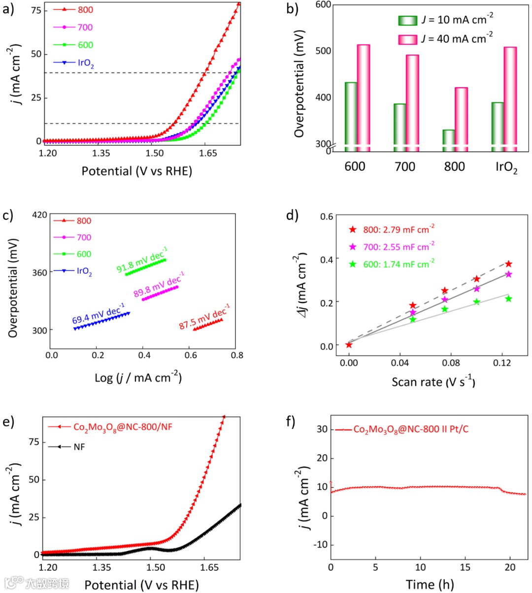 e) LSV curves of Co2Mo3O8@NC-800/NF and blank NF;