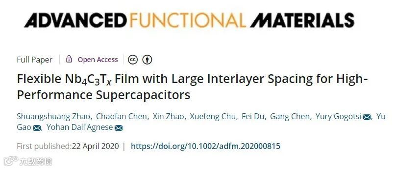 近日,Yury Gogotsi, Yu Gao, and Yohan Dall’Agnese等人在国际知名期刊Advanced Functional Materials (2018 影响因子:15.62)上发表题为“Flexible Nb4C3Tx Film with Large Interlayer Spacing for High-Performance Supercapacitors”的研究性论文。本文第一作者是Shuangshuang Zhao。