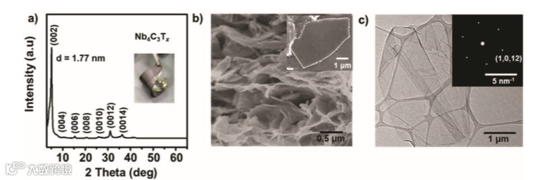 b) SEM image of a Nb4C3Tx film in cross-section (inset shows SEM image of a single fkake) and c) TEM image of a Nb4C3Tx flake. Inset in (c) shows a selected area electron diffraction pattern