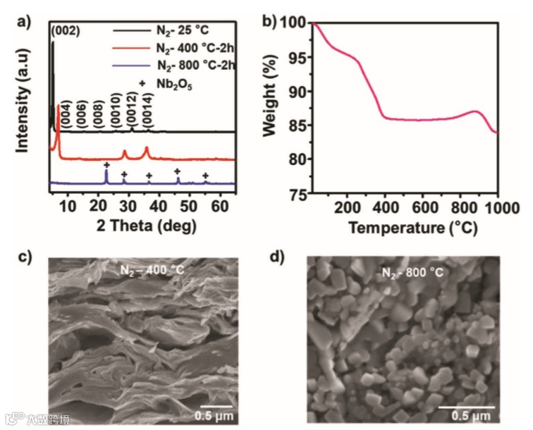 a) XRD patterns of Nb4C3Tx films treated at different temperatures in nitrogen.