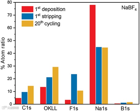 图3. 钠负极上SEI在不同循环阶段的原子组成比