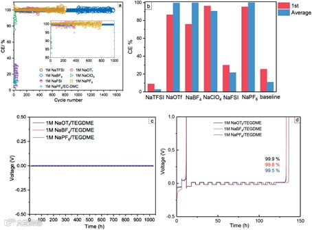 (b) Initial and average CEs of Na||Cu cells cycled in different electrolytes