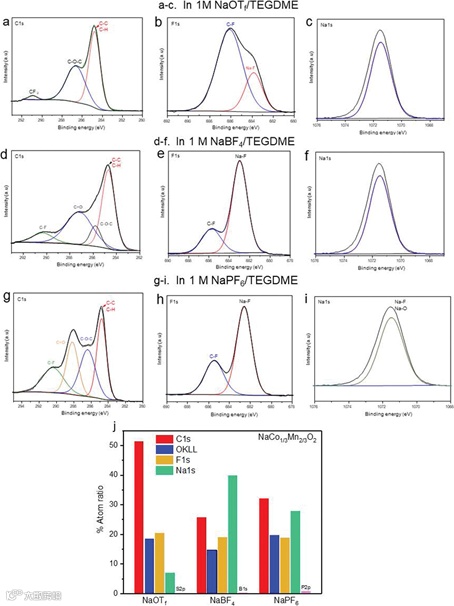 (a-c) 1 m NaOTf/TEGDME, (d–f) 1 M NaBF4/TEGDME, (g–i) 1 M NaPF6/TEGDME; spectra of C 1s, B 1s, Na 1s, F 1s, and Cu 2p3/2 lines are recorded.