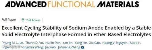 稳定钠负极的一种方法是使用添加六氟磷酸钠(NaPF6)的DME低浓度电解液,通过形成由氧化钠(Na2O)和氟化钠(NaF)组成的稳定表面膜来防止金属钠的枝晶生长,据报道,在Na||Cu电池中使用这种电解液,Na镀层/剥离的库仑效率(CE)非常高(高达99%)。然而,具有强刘易斯碱度的未配位DME,在高于4.0 V(vs. Na+/Na)的电压下容易发生严重的氧化分解。而使用氟化溶剂作为添加剂或共溶剂可以有效地提高醚基电解液的氧化稳定性。