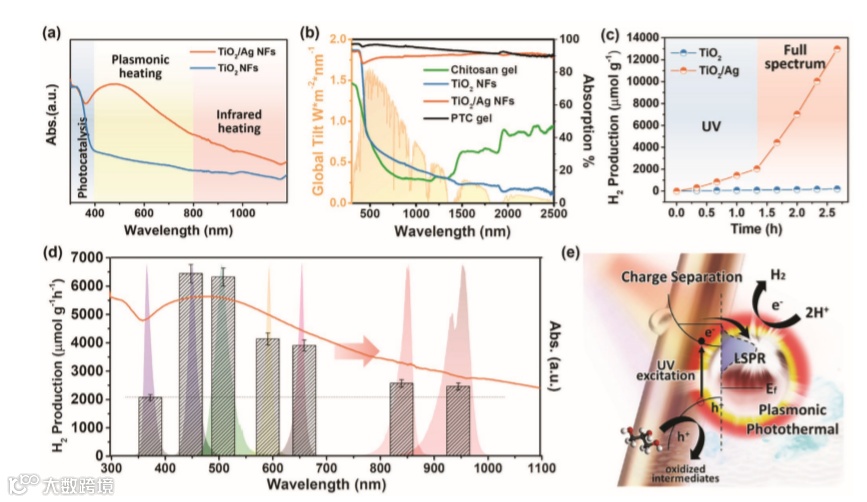d) The photocatalytic hydrogen generation rate of the TiO2/Ag NFs under different monochromatic light irradiation conditions, and its corresponding absorption spectrum.