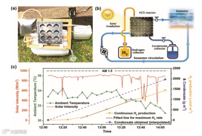 c) the measured results of the integral prototype for large-scale demonstration of concurrent photocatalysis and desalination of seawater under natural sunlight.