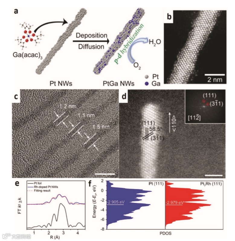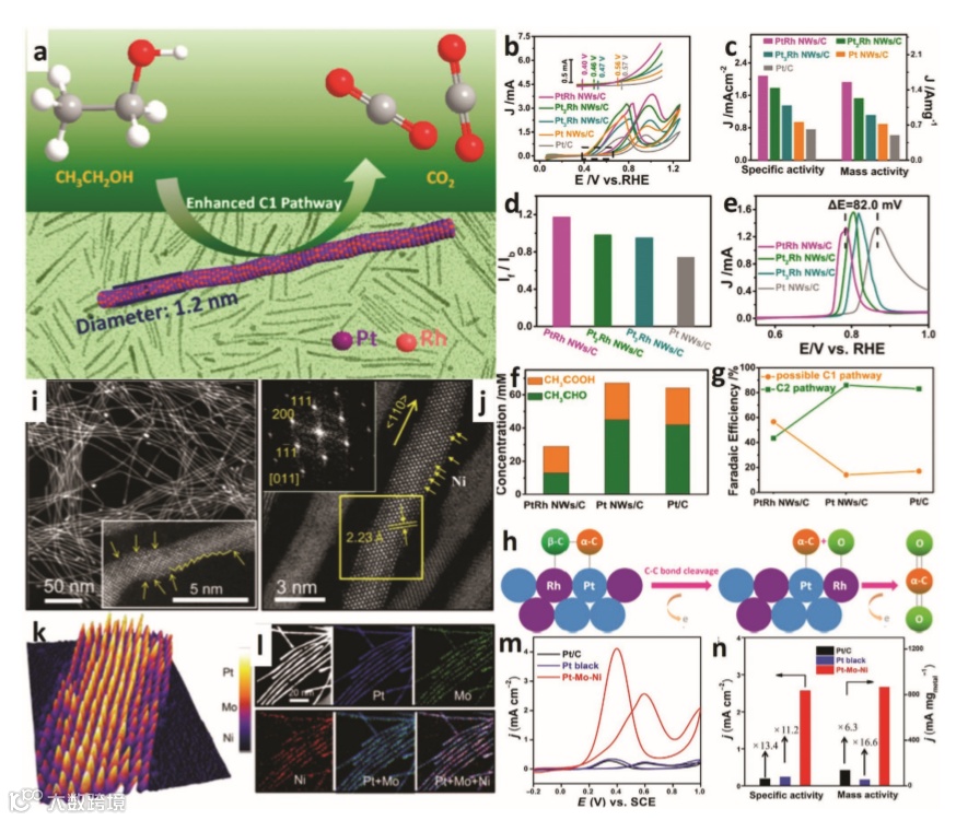 在这种情况下,卓越的催化剂应具有高的表面活性区,以提供足够的活性中心和适当的吸附能,从而优化反应中间体的吸附强度。在各种结构的铂基纳米催化剂中,1D纳米结构,特别是直径小于10nm的一维超细纳米线,由于其独特的各向异性、高的原子利用率、快速的电荷转移、良好的抗溶解性、聚集性、易奥斯特瓦尔德熟化等结构优点,而受到了广泛的关注。