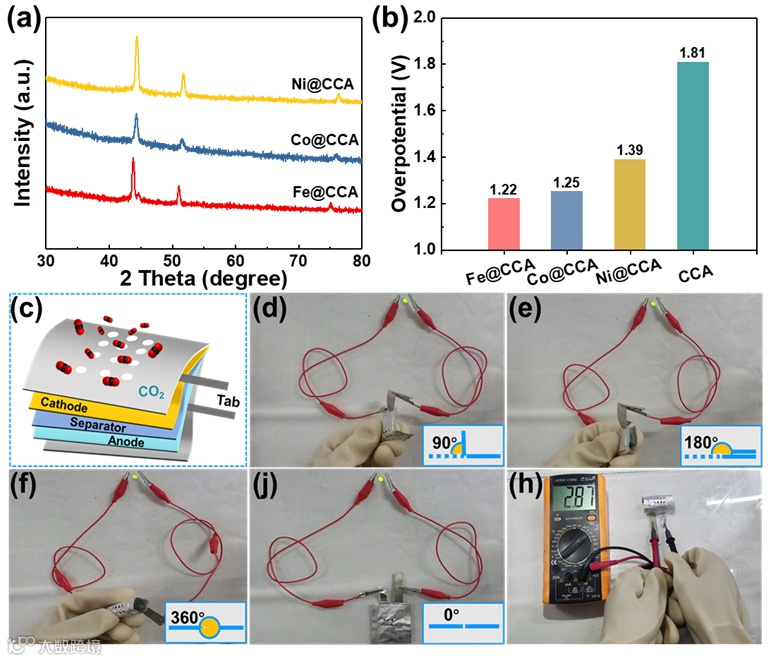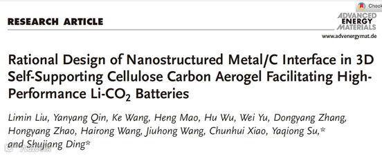 为了进一步证明金属/碳界面在改善CRR和CER反应动力学的普适性,作者又合成了一系列纤维素负载过渡金属/碳(Fe/C,Co/C,Ni/C)界面气凝胶,并将其应用于Li-CO2电池。结果表明,这些过渡金属/碳界面也可以显著提升Li-CO2电池的电化学性能。此外,作为概念验证实验,作者组装了Ru@CCA基柔性Li-CO2电池,得益于CCA优异的机械性能,CCA基Li-CO2电池在柔性可穿戴器件中表现出巨大的应用潜力。该工作成功发表于国际顶级能源期刊《Advanced Energy Materials》,论文第一作者为西安交通大学博士生刘理民,秦棪阳。
