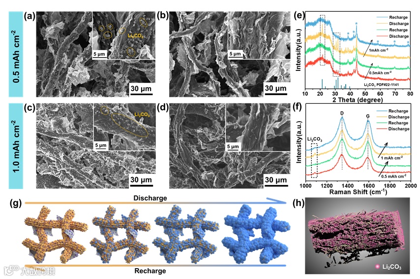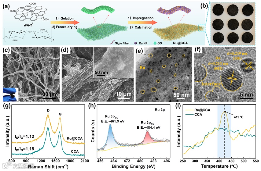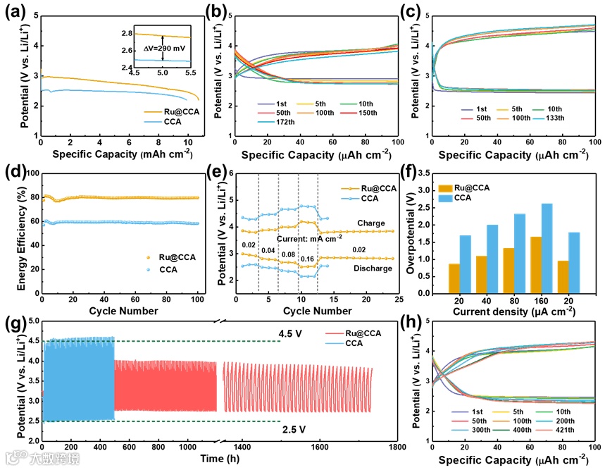 基于此,作者设计合成了一种具有丰富Ru/C界面的三维自支撑纤维素负载钌碳气凝胶(Ru@CCA),并将其成功应用于Li-CO2电池。得益于Ru/C界面优异的催化活性、CCA快的电荷和反应物传输速度及其广阔的产物沉积空间,Ru@CCA基Li-CO2电池能量效率高达80%、放电容量达10.71 mAh cm-2、在100 μA cm-2电流密度下循环寿命长达421圈。