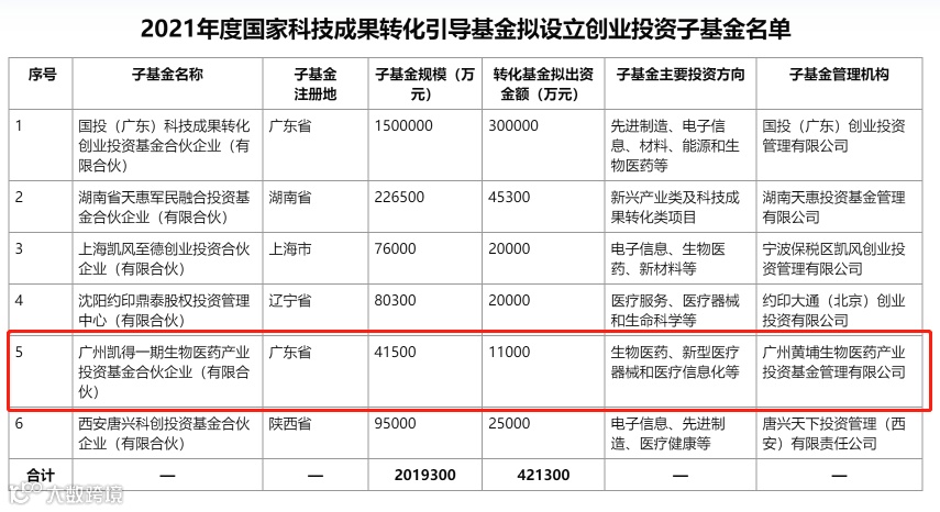 11月4日,2021年度国家科技成果转化引导基金拟设立创业投资子基金在科技部官网公示,公示信息显示:2021年度国家科技成果转化引导基金拟设立国投(广东)科技成果转化创业投资基金合伙企业(有限合伙)、湖南省天惠军民融合投资基金合伙企业(有限合伙)、上海凯风至德创业投资合伙企业(有限合伙)、沈阳约印鼎泰股权投资管理中心(有限合伙)、广州凯得一期生物医药产业投资基金合伙企业(有限合伙)、西安唐兴科创投资基金合伙企业(有限合伙)等6支创业投资子基金,合计出资额达42.13亿。其中单笔最大出资额为30亿,投资国投(广东)科技成果转化创业投资基金合伙企业(有限合伙)。