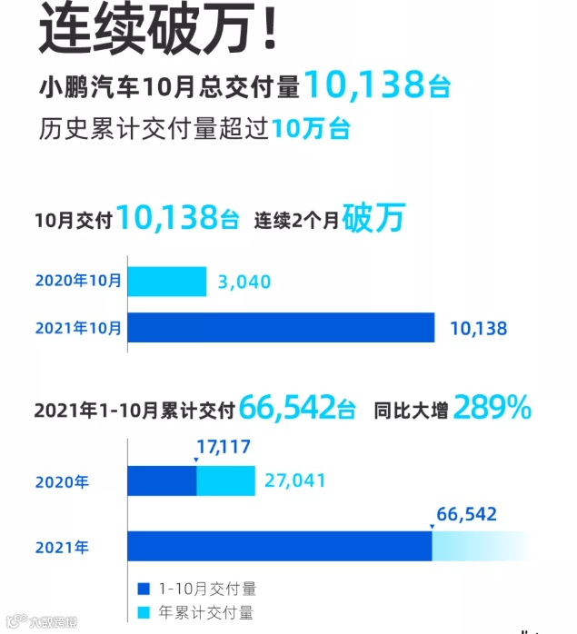 11月1日,小鹏汽车宣布,10月小鹏汽车总交付量10,138台,同比大增233%,其中小鹏P7共交付6,044台,同比增长187%。今年前10个月,小鹏汽车已累计交付66,542台,是去年同期的接近4倍,且截至今年10月底,小鹏汽车历史累计交付量已突破十万。