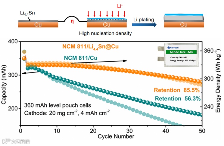 对于任何含锂正极材料的电池体系,无锂负极锂金属电池具有最高的能量密度。这种电池体系在充放电过程中锂离子从正极材料中脱出/嵌入,在负极铜箔表面沉积/溶解。由于铜箔的天然憎锂性导致不均匀的形核和较低的形核密度,往往导致全电池循环寿命较差。因此研发能实现致密锂沉积的基体材料,对抑制锂枝晶及提高锂利用率,推动高能量密度电池技术发展具有重要意义。