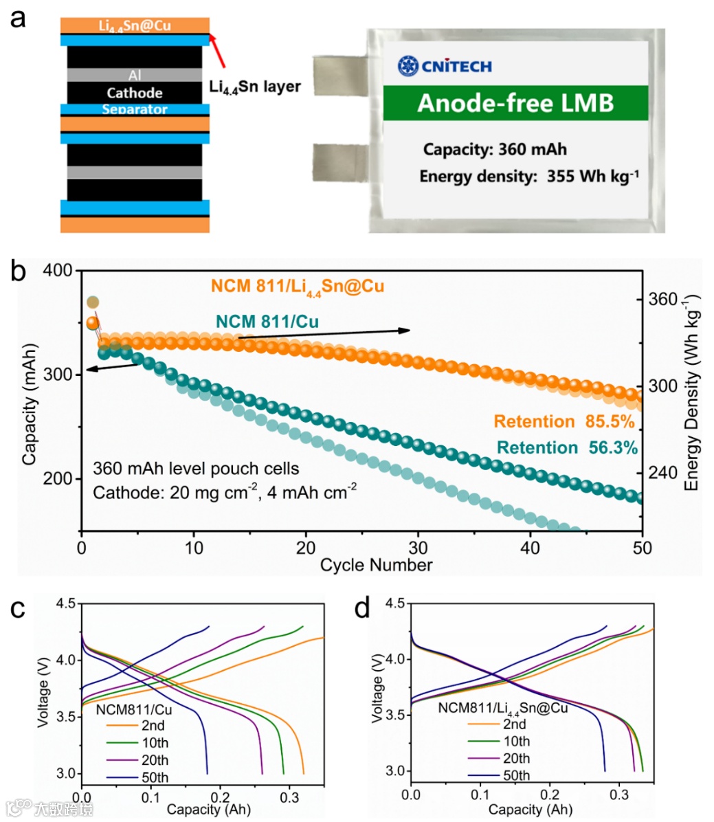 图4. a)无锂负极锂金属电池的结构示意图及数码照片,b) 使用Cu和Li4.4Sn@Cu电极的软包电池的循环性能,c-d) 使用Cu和Li4.4Sn@Cu电极的软包电池的充放电曲线