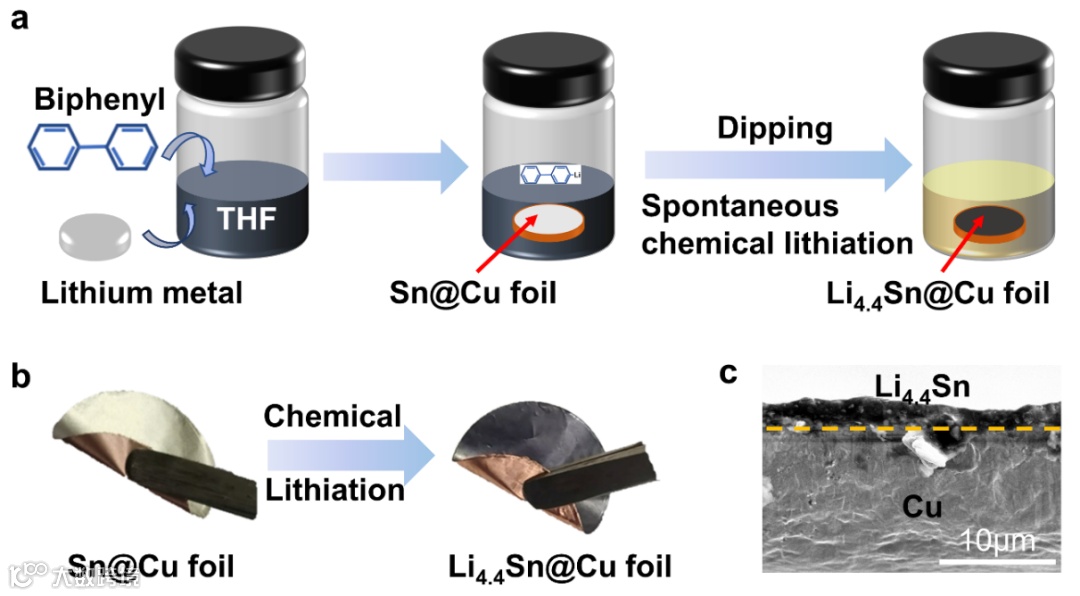 图1. a)Li4.4Sn@Cu电极制备示意图,b)Sn@Cu和Li4.4Sn@Cu电极的光学照片, c) Li4.4Sn@Cu电极的截面SEM图像