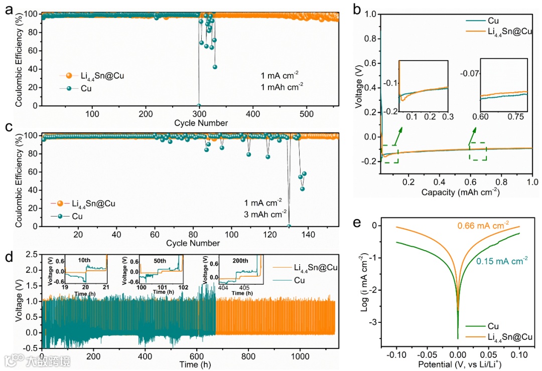 图2. Cu和Li4.4Sn@Cu电极在半电池中的电化学行为比较