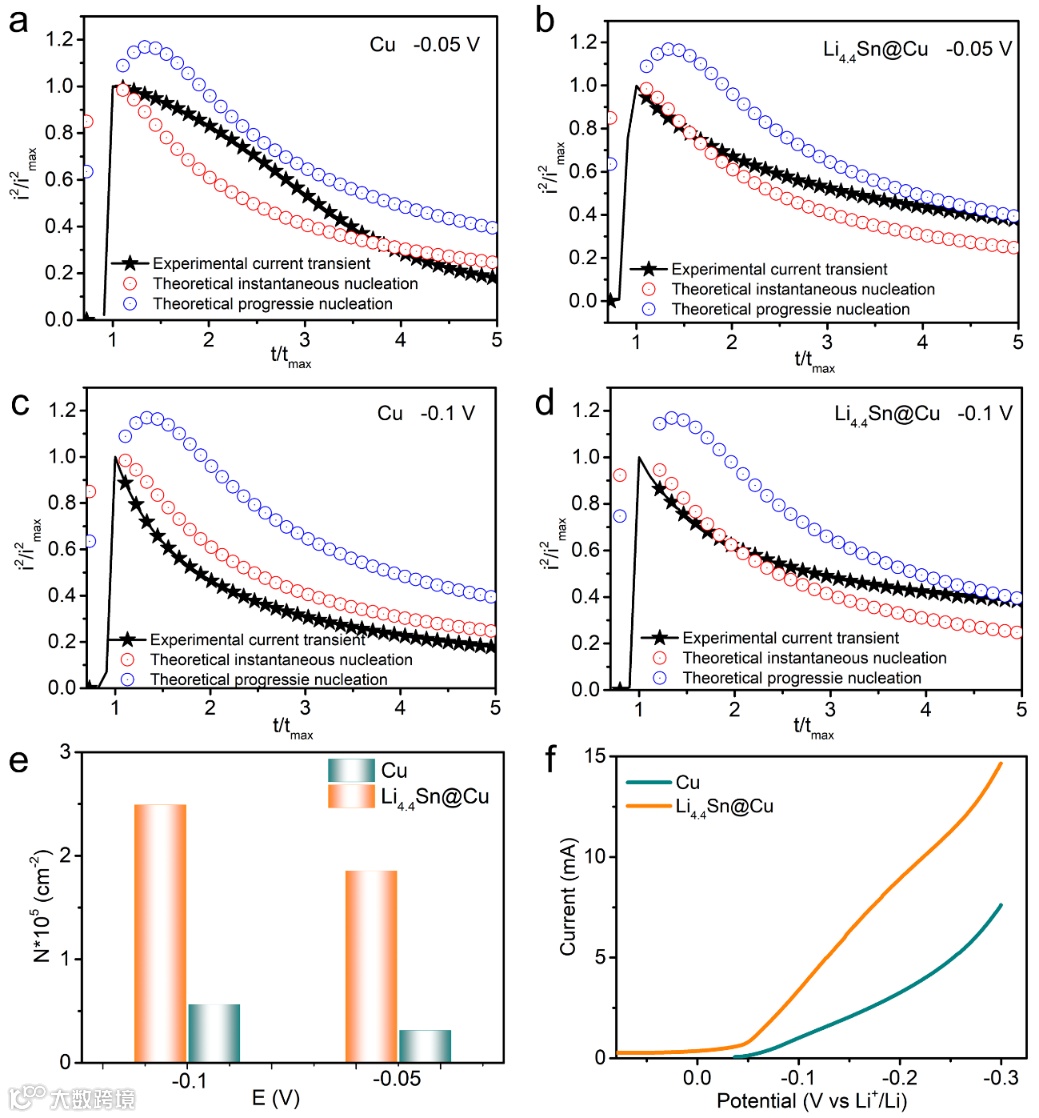 图3. a-d)锂在Cu和Li4.4Sn@Cu电极沉积的电流瞬态无量纲分析, e) 形核密度对比,f)Li+沉积在Cu和Li4.4Sn@Cu电极上的极化曲线