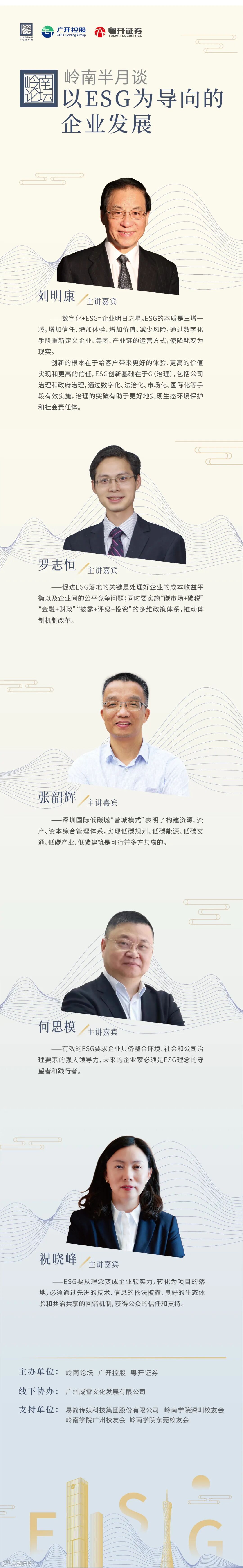 7月27日下午,由岭南论坛联合广开控股、粤开证券主办、凯得资本承办的岭南论坛半月谈圆桌会完美收官!此次活动邀请到了原中国银行业监督管理委员会主席、岭南论坛专家委员会委员刘明康教授、资本市场学院副院长张韶辉博士、粤开证券首席经济学家、研究院院长罗志恒博士、易事特集团股份有限公司董事局主席何思模博士、广州环保投资集团有限公司党委委员、副总经理祝晓峰作为主讲嘉宾发言,并邀请广州开发区控股集团有限公司严亦斌董事长为活动作开场致辞,现场汇聚了政、产、学、商、融界代表人士,与会嘉宾包括政府要员、资深学者、商界领袖等,一同探讨“以ESG为导向的企业发展”。