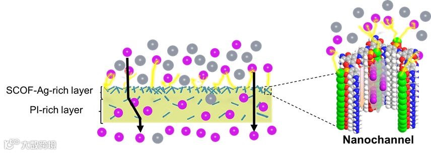 图1. SCOF-Ag/PI CMs复合膜内非对称结构,以及在COFs孔道内构筑的限域促进传递纳米通道。