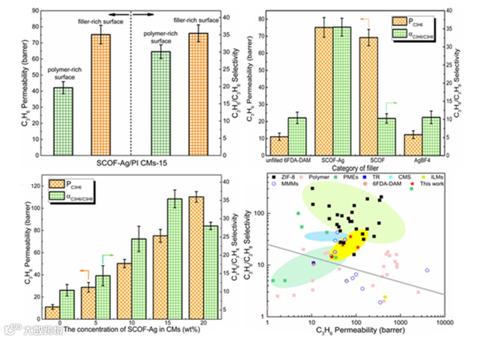 将SCOF-Ag填充到聚酰亚胺(PI)中制备得到的SCOF-Ag/PI CMs用于丙烯丙烷分离,相对于纯聚酰亚胺和将SCOF和AgBF4单独作为填充物比的复合膜相比较,其表现出非常优越的丙烯/丙烷分离特性,在充分利用COFs发达孔隙的同时,可以选择性的让丙烯分子快速通过。COFs内部高密度排布的传递载体,可以显著的降低促进传递机制对于Ag+阈值的要求,在Ag+填充量仅为4.2%时,实现很高的分离性能。