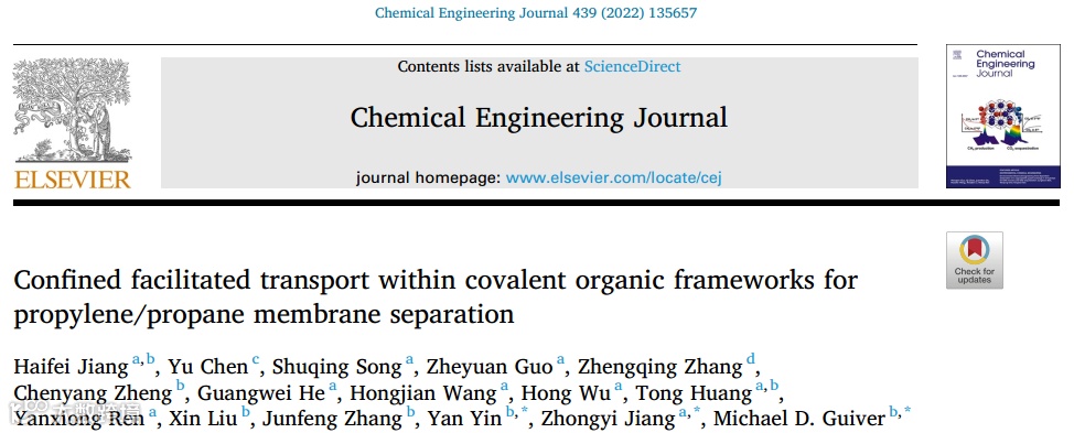 基于此,来自天津大学的Michael D. Guiver教授、姜忠义教授和尹燕教授合作,在国际知名期刊Chemical Engineering Journal上发表题为“Confined facilitated transport within covalent organic frameworks for propylene/propane membrane separation”的观点文章。