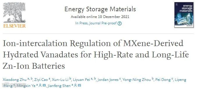 在这里,来自复旦大学的叶明新教授和沈剑锋教授,在国际知名期刊Energy Storage Materials上发表题为“Ion-intercalation Regulation of MXene-Derived Hydrated Vanadates for High-Rate and Long-Life Zn-Ion Batteries”的研究论文。