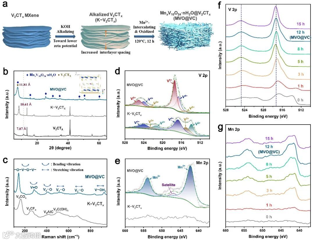 碱化V2CTx由于K离子的插层和层间空间的扩展,呈现出清晰的手风琴状结构。在随后的Mn2+插层和氧化过程中,碱化V2CTx原位转化为由宽度约为160 nm的扁平细长纳米带互连的微观结构,并保留导电碳框架。