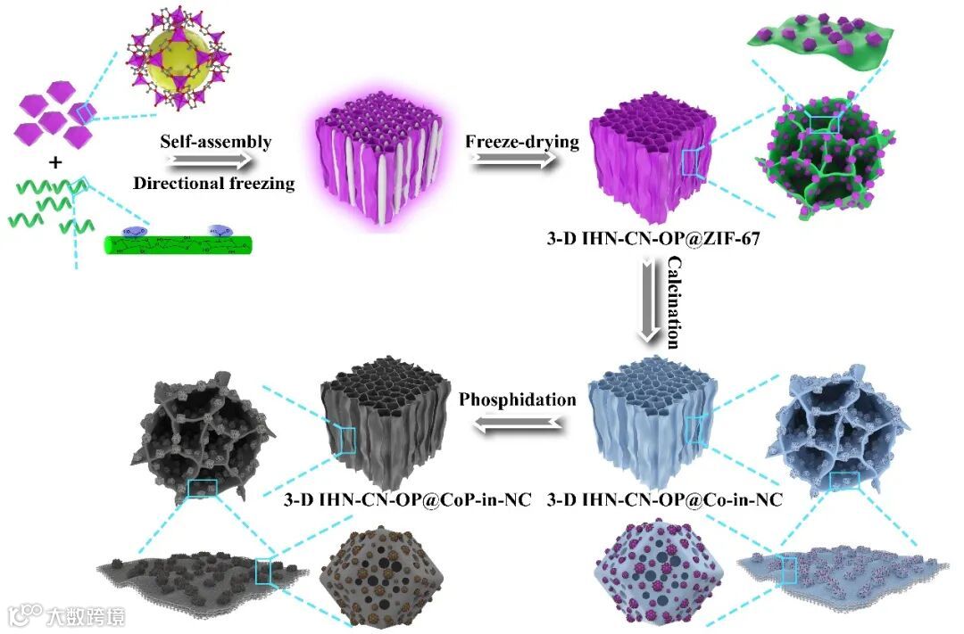 该文章通过定向冷冻辅助原位自组装合成具有定向大孔的三维结构ZIF-67 微粒包埋的纤维素纳米纤维(CNF)构筑的纳米片,并通过煅烧和磷化处理转化为三维结构CoP 纳米颗粒嵌入的分级且大孔导向的氮掺杂碳纳米片(下称3D IHN-CN-OP@CoP-in-NC)。
