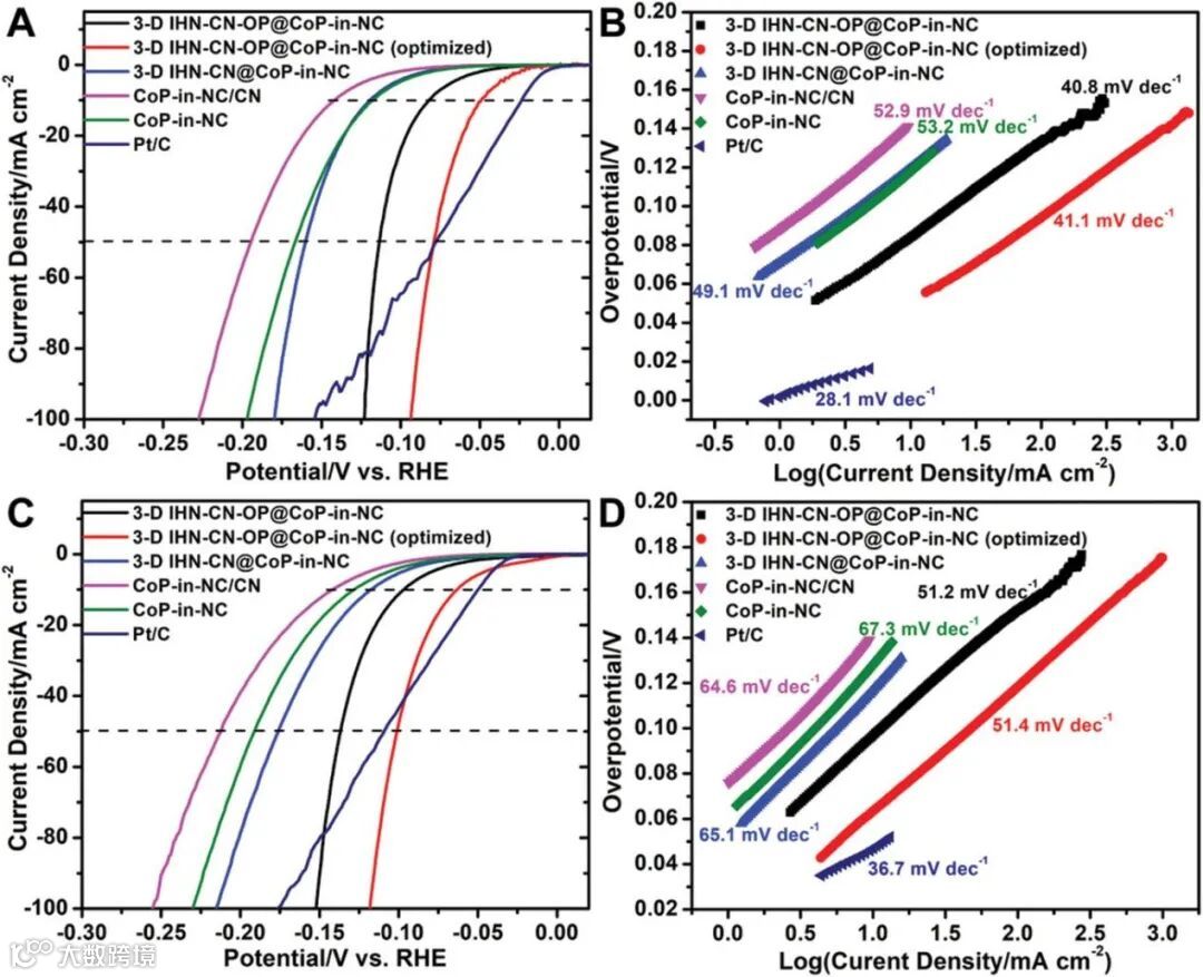 图3. 在0.5 M H2SO4 (A, B) 和在1 M KOH (C, D)中测试的3D IHN-CN-OP@CoP-in-NC, 3D IHN-CN-OP@CoP-in-NC (optimized), 3D IHN-CN@CoP-in-NC, CoP-in-NC/CN, CoP-in-NC和商业Pt/C的LSV(A, C)和Tafel (B, D) 曲线