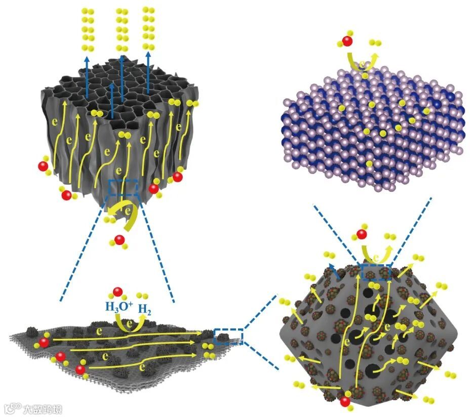 图4. 3D IHN-CN-OP@CoP-in-NC上HER反应中的电子传递/传输过程示意图