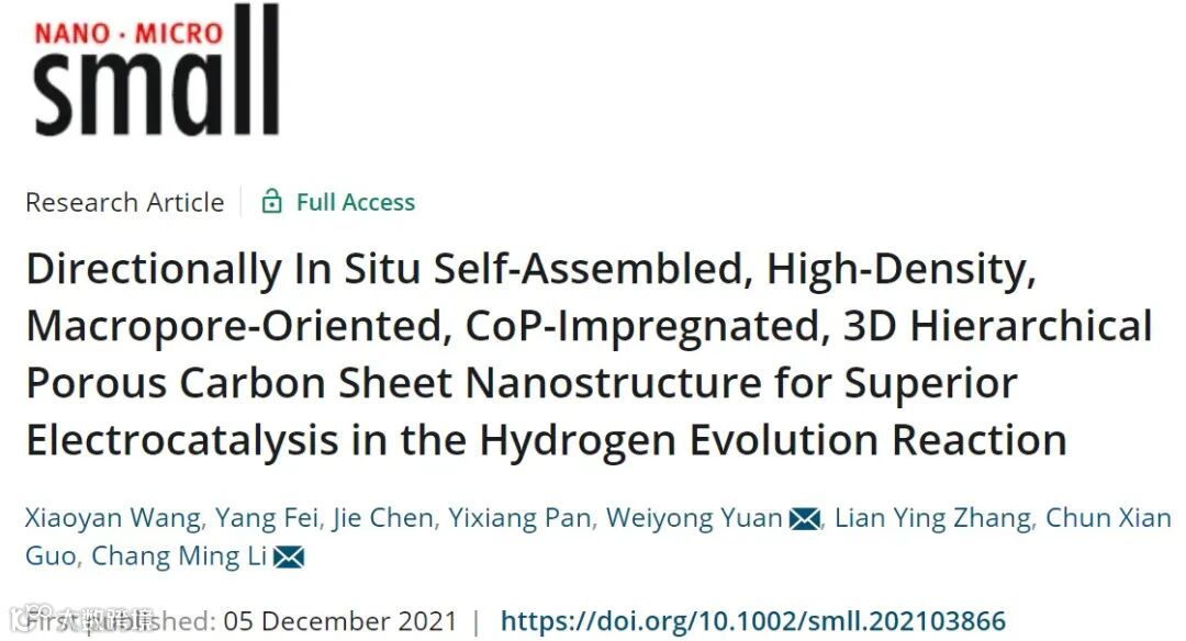 本文中,来自浙江大学宁波研究院的袁伟永研究员与西南大学的李长明教授合作,在国际知名期刊Small上发表题为“Directionally In Situ Self-Assembled, High-Density, Macropore-Oriented, CoP-Impregnated, 3D Hierarchical Porous Carbon Sheet Nanostructure for Superior Electrocatalysis in the Hydrogen Evolution Reaction”的文章。