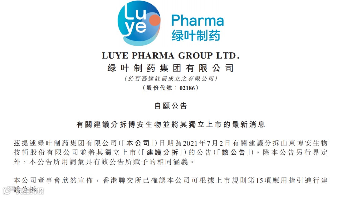 1月24日,绿叶制药发布公告,香港联交所已确认其可根据上市规则第15项应用指引进行建议分拆博安生物上市。