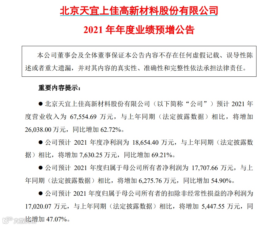 天宜上佳表示,公司正以新材料为主线,致力于发展成为工业消费品新材料平台型公司。从粉末冶金材料到碳基复合材料,公司围绕碳基复合材料应用领域打造业务的“第二成长曲线”。2021年,公司碳基复合材料业务取得较大进展,实现过亿收入,公司总体营业收入及净利润较上年同期实现较大幅度增长。