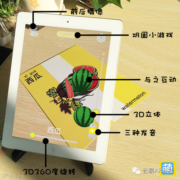 妈妈们是不是为了教自己的宝宝说话总是一遍又一遍指着说“西瓜、西瓜”呢?如果用卡萌APP扫描互动卡,屏幕上就会出现逼真的3D影像,同时有标准的发音,还可以选择中文、英文或者西班牙语噢!点击屏幕更可以触发更多场景效果,比如切西瓜、