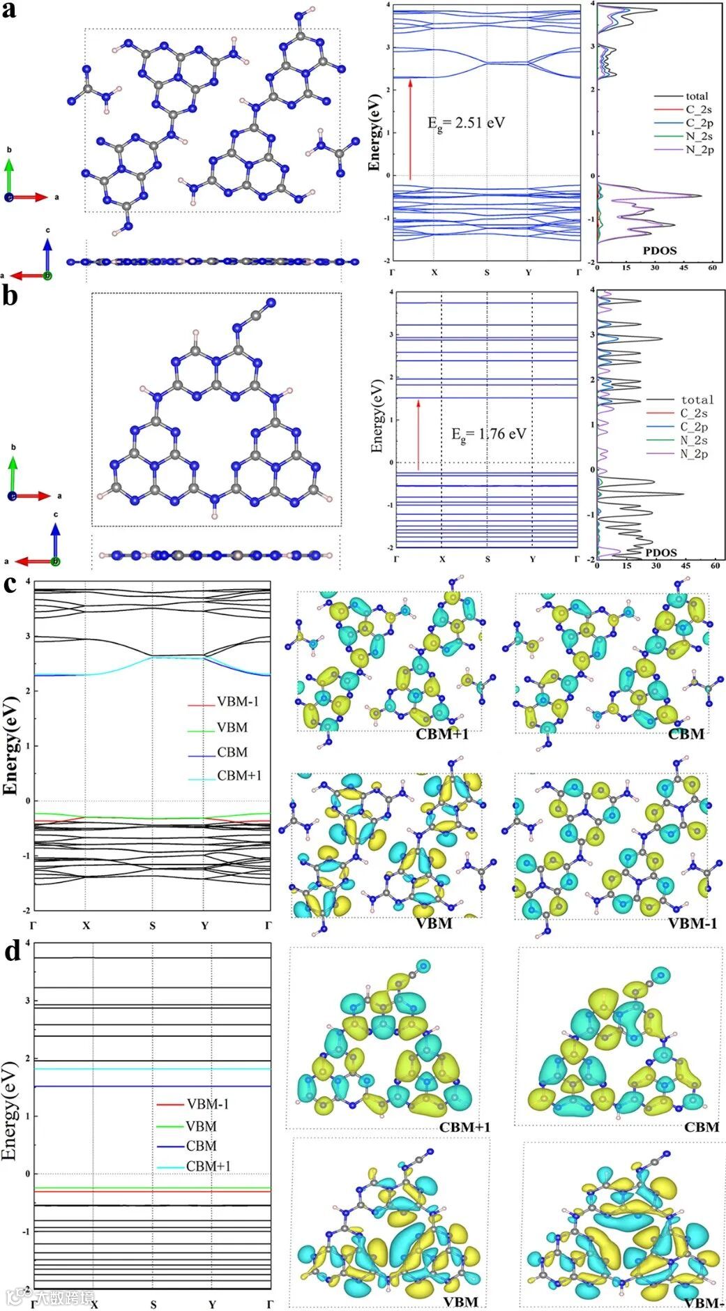 图 3. 样品的结构模型、计算的能带结构、相应的PDOS以及导带底(CBM和CBM+1)和价带顶(VBM和VBM-1)对应的电荷密度的空间分布图。