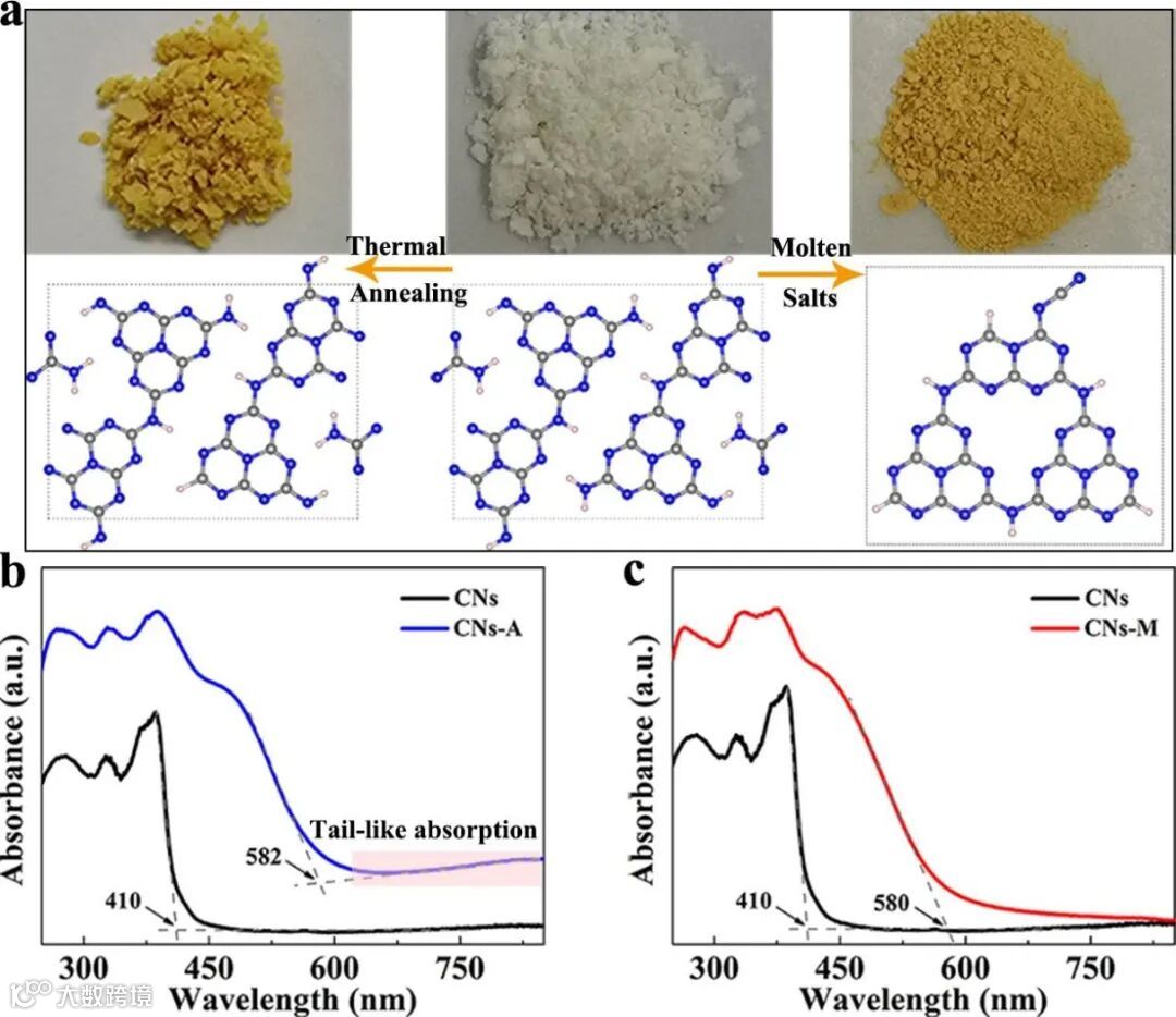 为了解决该挑战,科研工作者们已经进行了诸多努力,比如通过与芳香族化合物偶联或掺杂异质原子来修饰氮化碳的电子结构等。在一定程度上,这些尝试显示出它们在增加可见光吸收方面的有效性。然而,上述改性方法往往会引入带尾吸收,限制了其实际应用。