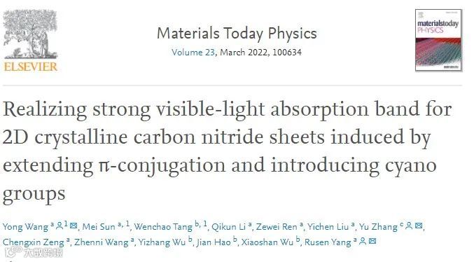 该成果以《Realizing Strong Visible-Light Absorption Band for 2D Crystalline Carbon Nitride Sheets Induced by Extending π-Conjugation and Introducing Cyano Groups》为题发表在(Materials Today Physics, 2022, 23(100634), IF:IF:9.298)上,西安电子科技大学杨如森教授、青年教师王勇以及陕西科技大学青年教师张瑜为论文共同通讯作者。