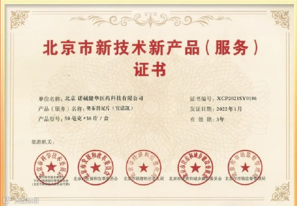 近日,诺诚健华宣布,公司凭借在技术先进性、创新性、潜在经济效益和较大市场前景等方面的核心优势,公司的奥布替尼片(宜诺凯)通过北京市五大政府部门权威认定,荣获“北京市新技术新产品(服务)证书”。