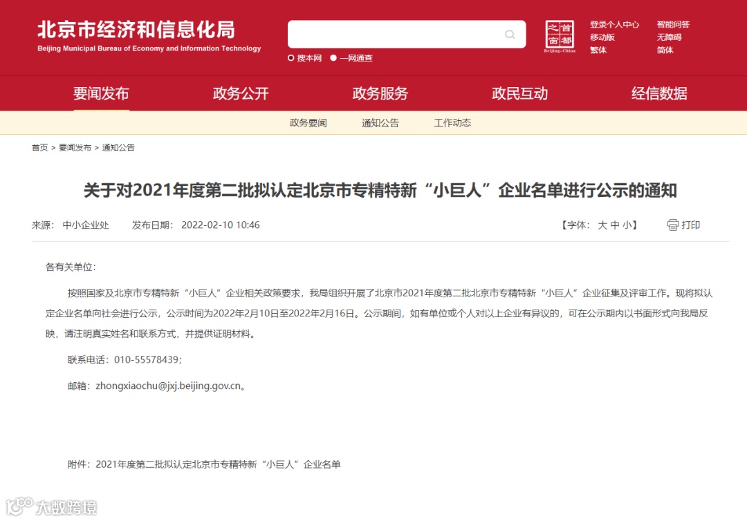 近日,北京市经济和信息化局官方网站发布了《关于对2021年度第二批拟认定北京市专精特新“小巨人”企业名单进行公示的通知》,北京天宜上佳高新材料股份有限公司成功上榜。