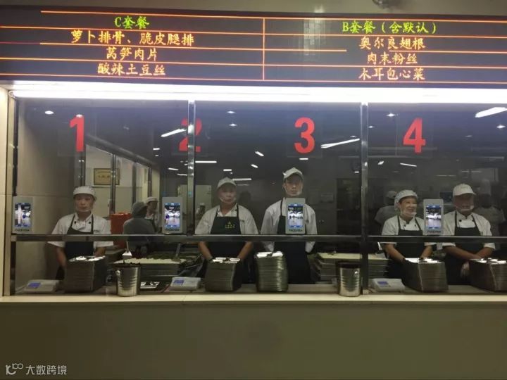进了食堂,5个打菜窗口屏幕上各自对应着“A、B、C、D、E”五个套餐,学生根据自己选定的套餐到相应窗口排队,秩序井然。