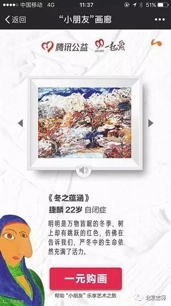 据该负责人介绍,活动前期,WABC机构选出50幅画作交给腾讯公益一方,腾讯的H5的制作团队又从中挑选36幅,所有画作均获得公益组织和作者授权。用户每购买一幅自闭症儿童的画作,就相当于向腾讯公益平台上的“用艺术点亮生命”公益项目进行了捐赠。