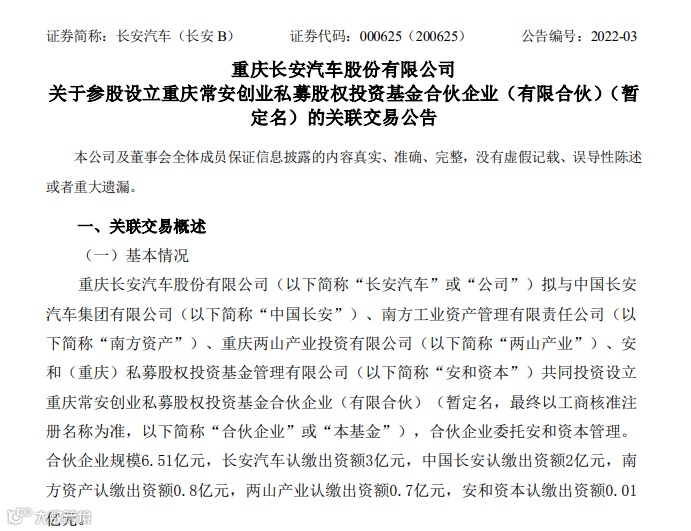 【11】长安汽车出资3亿元参与设立智能网联汽车核心前瞻领域产业投资基金