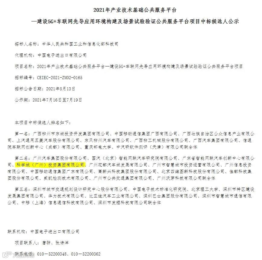 近日,在广州市工信局的指导下,在区委区政府的支持下,科学城集团与广州汽车集团、国汽(北京)智能网联汽车研究院、广东省智能网联汽车创新中心等单位组成联合体,中标工信部科技司“2021年产业技术基础公共服务平台—建设5G+车联网先导应用环境构建及场景试验验证公共服务平台项目”。