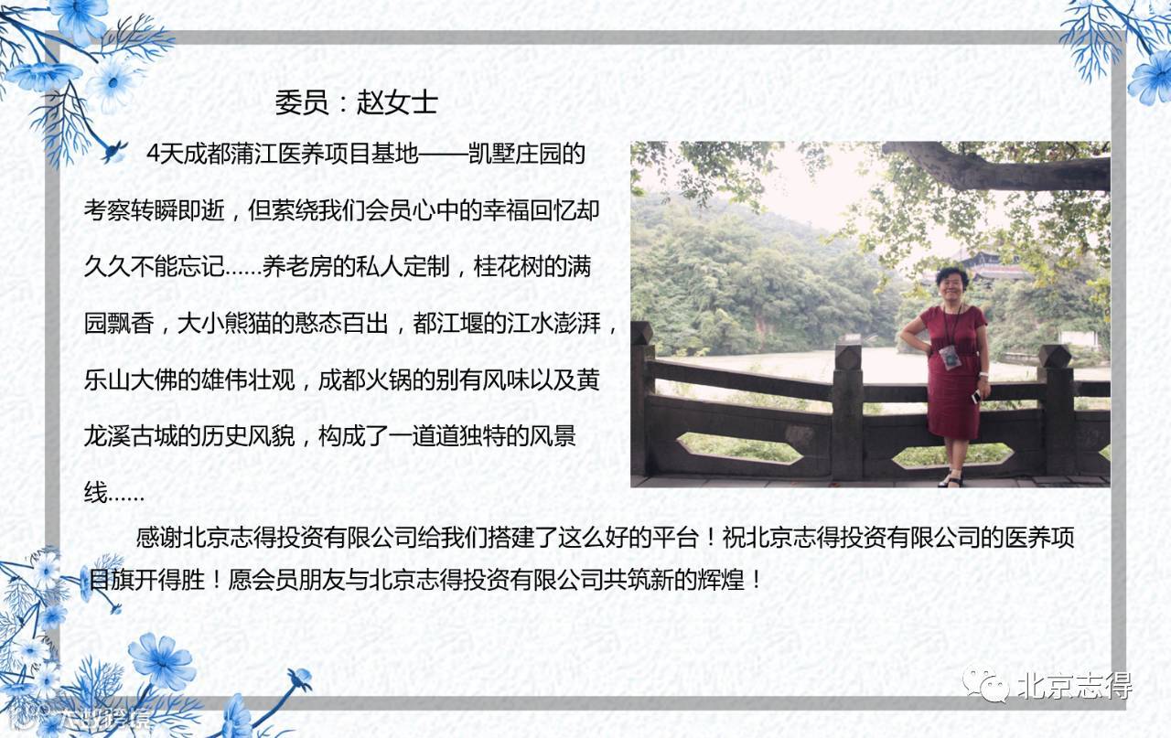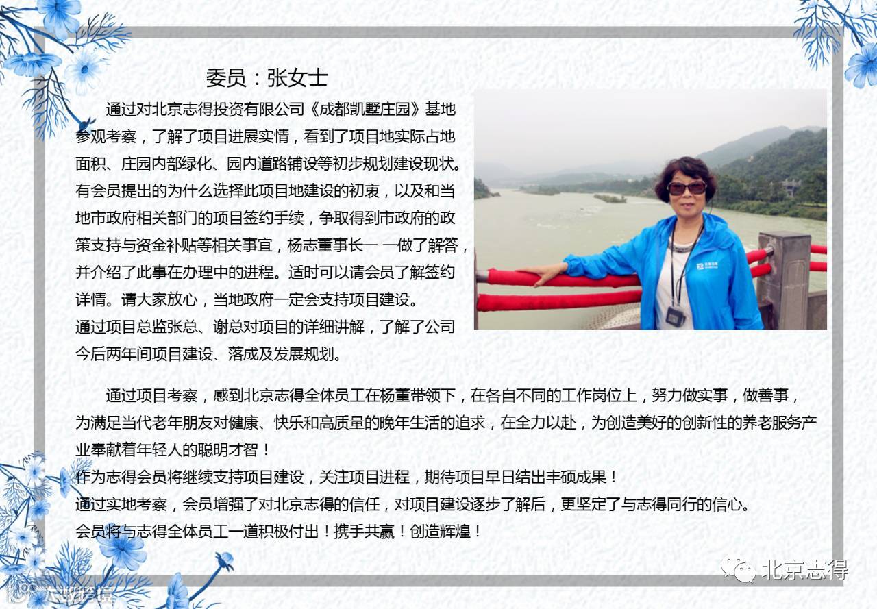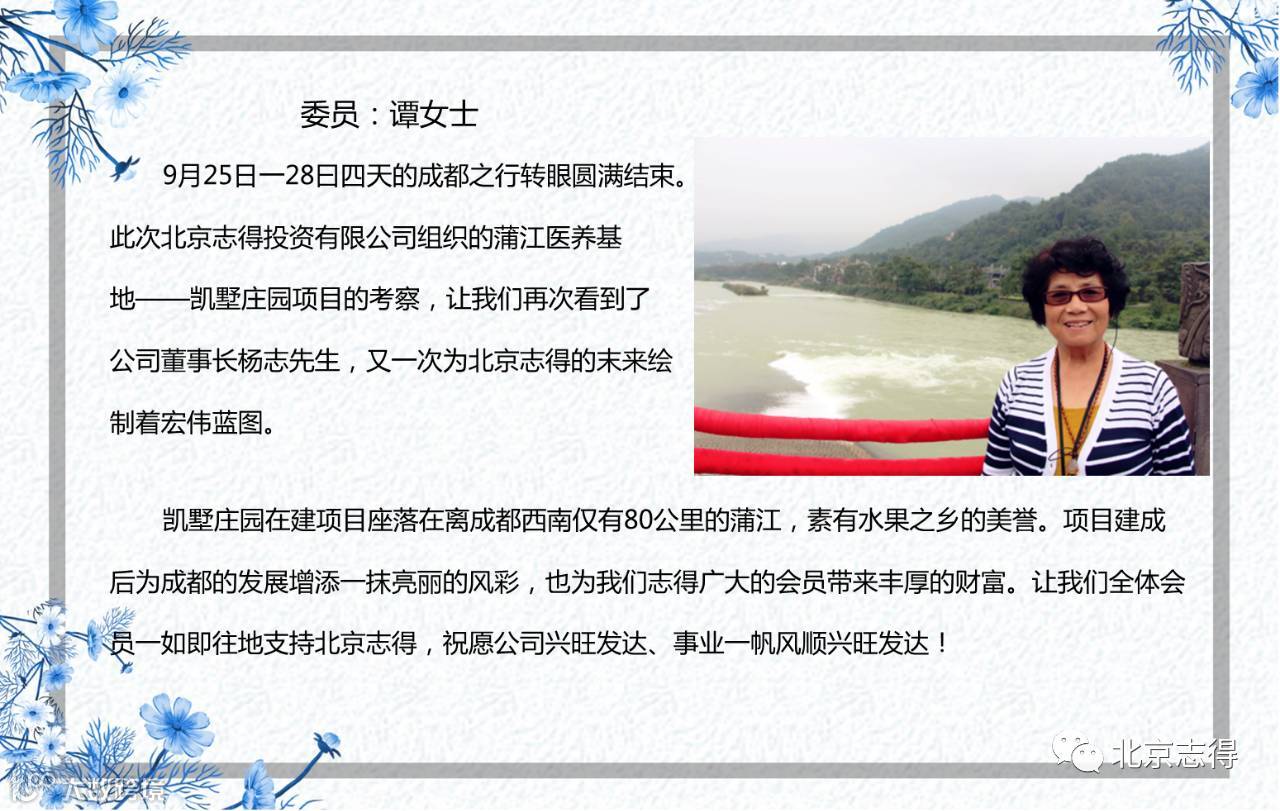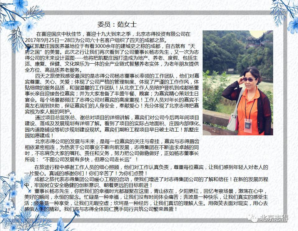 在北京志得9月25日-9月28日的成都凯墅庄园项目考察团中,有我们顾问委员会四位委员的身影,她们在行程当中,协助公司工作人员,帮助其他会员朋友,并且在行程结束后,第一时间发回她们本次的项目考察感悟。下面小志带大家看一看我们四位委员完成本次考察后的心得体会: