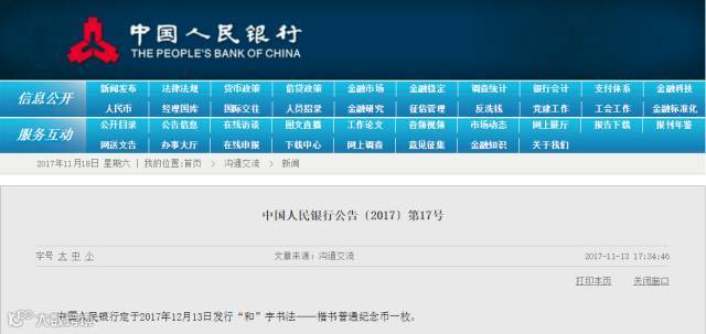 据中国人民银行网站消息,中国人民银行定于2017年12月13日发行“和”字书法——楷书普通纪念币一枚。面额5元,直径为30毫米,材质为黄色铜合金,发行数量为2.5亿枚。