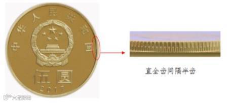一、直全齿间隔半齿:硬币边缘分布有交替排列的全齿与半齿。
