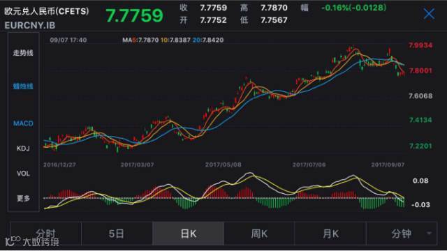 一周以来,人民币不止在对美元升值,也在欧元升值。人民币对欧元中间价,从8月29日的阶段性高点7.9333,持续升值到7.7841。