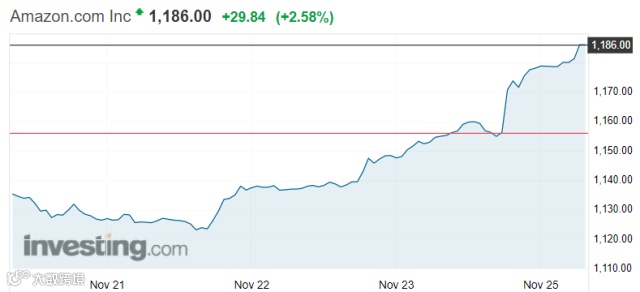 今日(11月25日),亚马逊一路刷新纪录高位,收报1186美元,上涨2.58%,连续三个交易日(11月23日因感恩节而休市)创收盘纪录新高,本周(四个交易日)涨幅扩大至4.97%,2017年迄今涨58.18%。