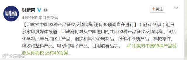 印度政府于当地时间周三(9日)宣布,对93种从中国进口的产品征收反倾销税。不过,中国媒体普遍报道这个消息,是昨天(12日)上午。