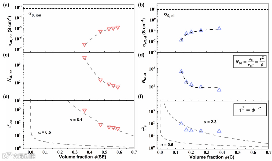 图6. a,b)正极的有效离子/电子电导率随体积分数的变化;c,d)正极中离子和电子的MacMullin number NM值随体积分数的变化;e,f)正极中离子和电子的曲折因子随体积分数的变化。