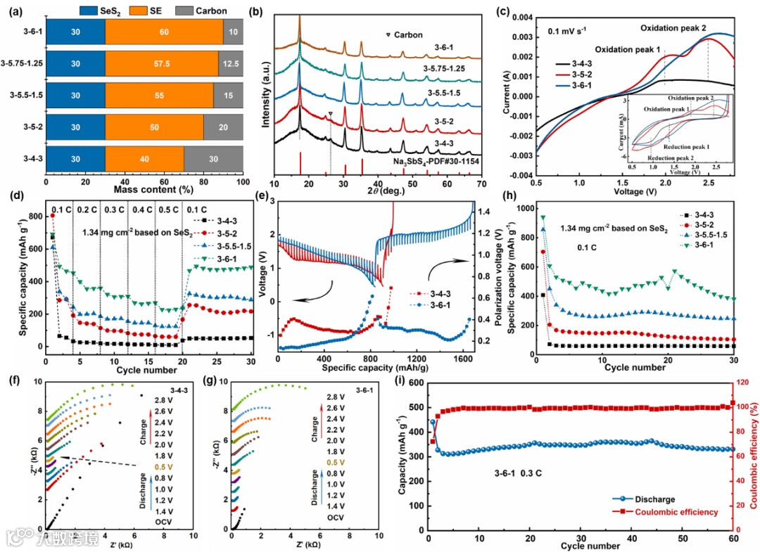 该工作构筑了不同SE/C质量比的复合正极(如图5),将活性物质的质量分数控制在30%。固态电池的CV测试发现,随着电解质含量的增加,氧化峰强度逐渐增加,表明随着电解质含量的提升,复合正极的有效离子传输能力增加,促进了Na2Se和Na2S的分解。